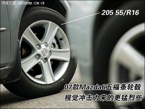说实话,外形方面,迈腾和Mazda6都没什么可更多讲解的,统统是熟脸。虽然迈腾是新车,但是盾形的家族前脸和饱满的线条让大家看起来并不陌生,接受起来也相对容易了许多;07款Mazda6的虽然也是新车,但是Mazda6已经在国内销售了多年,没有什么让人新鲜的感觉,倒是07款的五福条轮毂在视觉冲击力方面要比迈腾的多幅条轮毂来的猛烈了许多。运动和沉稳的风格,从二者“下半身”就开始区分了。