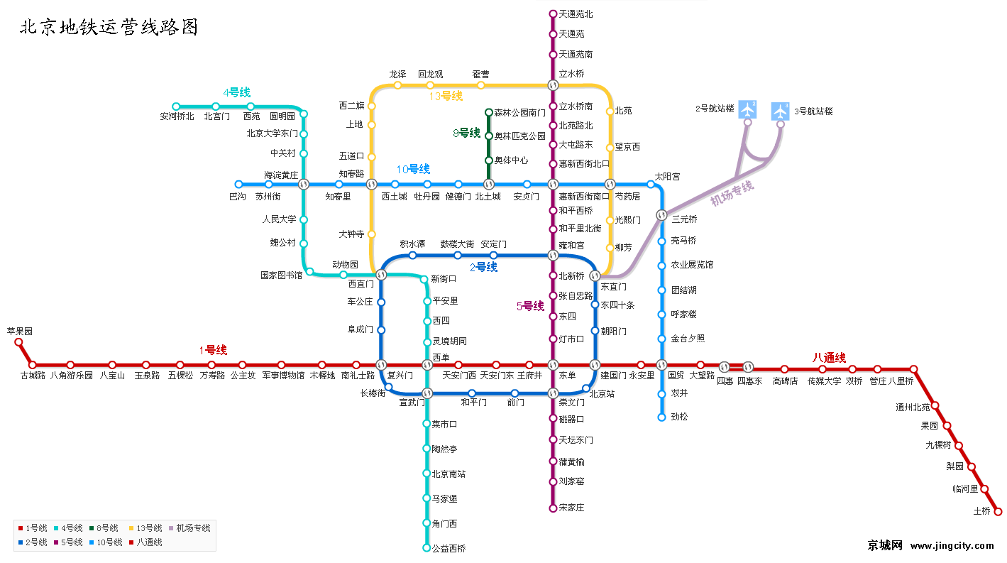 推荐:北京地铁运营线路图最新版 北京地铁运营线路图2009年版 最新北京地铁运营线路图(含地铁4号线)包括了截至2009年9月28日已经通车运营的所有北京地铁线路图,也是目前最新的北京地铁运营线路图,运营线路包括1号线(一线)、 2号线(环线)、13号线、八通线、4号线、5号线、10号线、8号线(奥运支线)、L1线(机场线)。 2009北京地铁运营线路图(包括地铁4号线) (点击查看详细大图) 北京地铁已运营线路站点详细资料 1. 1号线:已开通的线路,全长30.44千米,设23站。各站站名:黑石头、高井、福寿岭、苹果园、古城路、八角游乐园、八宝山、玉泉路、五棵松、万寿路、公主坟、军事博物馆、木樨地、南礼士路、复兴门、西单、天安门西、天安门东、王府井、东单、建国门、永安里、国贸、大望路、四惠、四惠东。其中黑石头、高井、福寿岭站为非运营车站。 2. 八通线:已开通的线路。2000年12月开始修建北京地铁八通线,八通线是北京地铁1号线的东段延长线,西起四惠站东至土桥站,全长18.964千米,设四惠、四惠东、高碑店、广播学院、双桥、管庄、八里桥、通州北苑、果园、九棵树、梨园、临河里、土桥共13座车站。“八通线”之名起源于“复八线”的延伸,“复八线”原计划从复兴门到八王坟,在修建之前即确定了“八通线”之名,此后建设的“八通线”虽然是由四惠站修建到通州土桥,“八通线”之名却一直沿用了下来。为加快东部地区的发展,北京市政府计划将地铁1号线和地铁八通线贯通。 3. 2号线:已开通的线路。全长23.1千米,共设18站。各站站名:西直门、车公庄、阜成门、复兴门、长椿街、宣武门、和平门、前门、崇文门、北京站、建国门、朝阳门、东四十条、东直门、雍和宫、安定门、鼓楼大街、积水潭、西直门。 4. 4号线:北京地铁4号线南起丰台马家堡西路,终点站为颐和园北宫门北边的龙背村,全程运营行车时间大致为47分钟,一共设24座车站,自南向北依此为:公益西桥站、角门西站、马家堡站、北京南站、陶然亭站、菜市口站、宣武门站(换乘2号线)、西单站(换乘1号线)、灵境胡同站、西四站、平安里站、新街口西站、西直门站(换乘2号、13号线)、动物园站、国家图书馆站、魏公村站、人民大学站、海淀黄庄站(换乘13好线)、中关村站、北京大学东门站、圆明园站、西苑站、北宫门站、安河桥北站,公益西桥站设置马家堡车辆段,安河桥北站设置了一座停车场。 6. 5号线:已开通的线路。这条线路北起昌平区太平庄,南至朝阳区宋家庄,全长27.6公里。共设23座车站:天通苑北站、天通苑站、天通苑南站、立水桥站、立水桥南站、北苑路北站、大屯路东站、惠新西街北口站、惠新西街南口站、和平西桥站、和平里北街站、雍和宫站、北新桥站、张自忠路站、东四站、灯市口站、东单站、崇文门站、磁器口站、天坛东门站、蒲黄榆站、刘家窑站、宋家庄站。2007年10月7日投入试运营。 6. 8号线:建设中的线路。线路全长28.4公里,设19站,分别是朱辛庄、龙铭苑站、回龙观东站、霍营北站、霍营站、西三旗站、西三旗南站、永泰站、林翠路站、森林公园南门站、奥林匹克公园站、奥体中心站、北土城站、安华桥站、安德里站、鼓楼大街站、后海站、地安门站和美术馆后街站。 奥运支线:已通车线路。奥运支线是地铁8号线一期工程,从北土城站到森林公园南门,全长4.528公里,共设4座车站,分别为北土城站、奥体中心站、奥林匹克公园站、森林公园站,已于2008年7月19日通车试运营,10月8日对公众开放。 7. 10号线:线路全长57.13公里,设地下车站45座。一期线路已通车,长24.65公里,设车站22座,具体是巴沟站、苏州街站、海淀黄庄站、知春里站、知春路、西土城站、牡丹园站、建德门站、北土城站、安贞门站、惠新西街南口站、芍药居站、太阳宫站、三元桥站、亮马桥站、农业展览馆站、团结湖站、呼家楼站、金台夕照站、国贸站、双井站、劲松站。二期线路正在建设,全长33公里,设车站24座,预计2012年通车。 8. 13号线:已开通的线路,西起西直门,东至东直门,全路线呈倒U字形,全长40.5公里。共设16个车站,各站站名为西直门、大钟寺、知春路、五道口、上地、西二旗、龙泽、回龙观、霍营、立水桥、北苑、望京西、芍药居、光熙门、柳芳、东直门。于2003年1月9日全线开通。 9. 机场线: 机场快轨,已开通的线路。机场线是从东直门至北京首都国际机场的路线,全长27.3公里,共设置东直门、麦子店西路、2号航站楼和3号航站楼4座车站。2008年7月19日开通运营。 |
