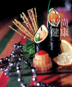 紫菜芝士烤海螺(图片来源时尚健康) 浪漫表情:两相依 催情元素:海螺。具有浪漫寓意的甜蜜造型菜式,正符合此时渐入佳境的情境。 材料:海螺肉50克,紫菜1张,芝士片15克,芦笋10克,青红椒各5克,土豆20克,香葱1根,拉面、柠檬少许 配料:盐、味精、料酒、胡椒粉、鱼香汁 制作方法: 1、将海螺肉切条,加入盐、味精、料酒、胡椒粉腌几分钟。芦笋切条,青红椒切丁,然后一起用芝士和紫菜卷成卷。芝士在里面,紫菜在外面。在180℃烤箱中烤5分钟。 2、土豆用模具压成型,焯水后加盐入味,挂面在热油中炸熟后,插在烤好的一小截紫菜卷中作装饰。 3将材料摆盘,浇上鱼香汁,再撒上柠檬碎即可。