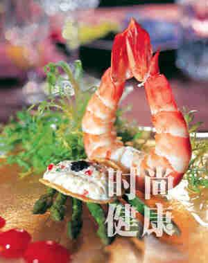 鲜芦笋凤尾虾(图片来源时尚健康) 鲜芦笋凤尾虾 浪漫表情:爱神的箭 催情元素:芦笋、鱼子酱。相谈正欢,正适合用这道主菜来含蓄地表达对他的爱意。 材料:大虾2只,芦笋40克,土豆40克,青椒、红椒各10克,黑鱼子酱5克,花叶生菜10克,薯片1片 配料:番茄沙司、盐、味精、料酒、胡椒粉、白醋、蛋黄酱 制作方法: 1、将大虾放入水中煮熟,去皮后去头留尾,然后加入盐、味精、料酒、胡椒粉,在220℃烤箱中烤3分钟。 2、将土豆切成米粒状,在沸水中焯熟。青红椒也切成米粒状,与切好的土豆、黑鱼子酱一起加入蛋黄酱、盐、胡椒粉、白醋,拌匀后放在薯片上。 3、将芦笋焯水,加入盐调味。 4将以上所有材料摆盘,然后点上番茄沙司即可。