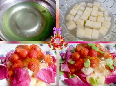 材料: 草莓洗净去蒂,苹果一只洗净去皮,梨一只洗净去皮,玫瑰花瓣适量,以盐水泡一会,捞出晾干,果冻粉(绿茶味),炼奶适量。 制作: 先在一容器中加开水,放入果冻粉入冰箱冷藏使其凝固,苹果和梨分别切成小方块,在盐水中浸泡一会,待果冻成形后取出,将苹果梨放在底层,加上玫瑰花瓣,放果冻,草莓,浇上炼奶拌匀,撒上煮过的鲜蚕豆瓣,即可。