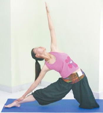 门闩式动作二 动作二: 呼气,将躯干和右臂屈向右腿,右手沿着右膝伸向右脚趾的方向。左臂充分的向上伸展,眼睛看着左手指尖的方向,保持着均匀的腹式呼吸。 门闩式可以帮助消除腰围线上的脂肪,补养和增强腹部的肌肉和器官。保持这个姿势45秒钟,躯体和双臂恢复原位,交换双腿的位置。左右两边保持姿势的时间要相等。 |