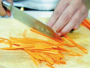 胡萝卜去皮,切成丝状;蒜头剁成蓉,葱切成葱花。