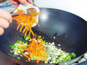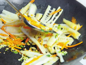 烧热锅内4汤匙油,爆香蒜蓉、葱花,倒入胡萝卜丝、春笋片和3汤匙清水,大火翻炒2分钟。