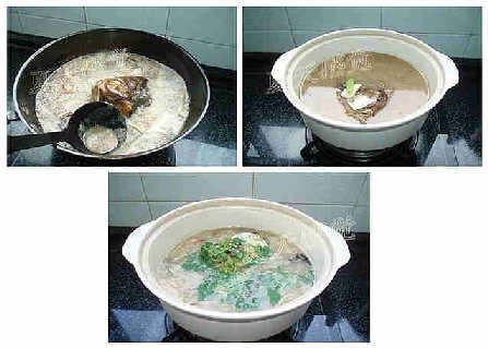 做了烧鱼块把剩下的鱼头煲了汤,煲汤之前先将鱼头煎一下,汤里再放黄酒,这样煲出来的汤不会有腥味,而且汤味更加浓郁! 做法: 1、鱼头抹上酱油笋香菇切片香菜切碎,锅加油烧热放入鱼头煎至两面金黄。 2、加入黄酒葱姜香菇笋片和水,烧开后撇去浮沫,倒入砂锅中火煲30分钟,加入盐鸡粉胡椒粉和香菜。 |