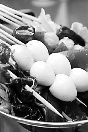 流行于北京的烤串,现在分出了两大派系,新疆风味和东北风味。新疆风味保持了原有的炭烤方式,调料以孜然及辣椒面为主,烤串的种类不多,却串串香。大到新疆办事处,小到阿达西,都是新疆风味烤串的代表之地。东北风味则是近几年新兴的,种类丰富,选择性大,调料也从孜然和辣椒发展到各式调味酱,酷烤、池记算是这类串店的先行者。 毛豆 到了夏天,北京满大街都能看到毛豆的身影,而且总觉得路边摊、简单作坊料理出的毛豆才最好吃。放了花椒、大料,盐水煮出来的毛豆,讲究的是豆饱满得要将皮撑开,料丰富得要渗入豆中。等待热菜上桌的时候,它是最好的消磨时间的小吃。 麻辣烫