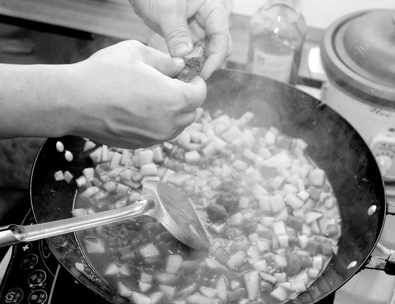 操作步骤: 1、将五花肉、洋葱、土豆、胡萝卜切成2cm见方的小丁块; 2、将五花肉炒成七分熟,加少许酱油调成浅红色,然后捞出; 3、洋葱倒进热锅爆炒,香味一出就捞出; 4、爆炒土豆和胡萝卜,加酱油,再加入五花肉、洋葱,并加水漫过菜,小火焖烧; 5、用少量冷水拌匀咖喱粉,然后倒入锅中搅匀;