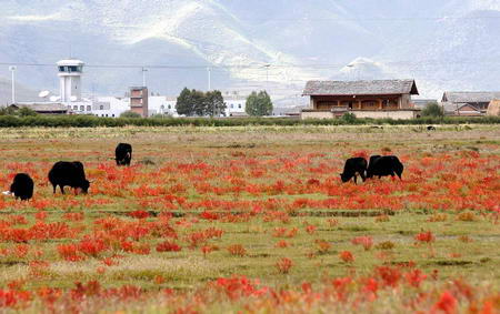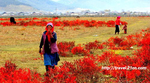 “春色”无边:沿着滇藏公路从丽江到香格里拉,近乎200公里的车程,五脏六腑翻江倒海般直打鼓,但为了寻找那片火红的狼毒花,一路的颠簸显得有意义。突然,一抹猩红在一片阴霾的暗绿中跳脱出来,接着猩红的颜色渐次多了起来。放眼草甸,似打翻了的调色碟,猩红烂漫,红色蔓延,越来越放纵,最后倾覆在整片草甸上,那铺天盖地席卷而来的红,让初入此地的人看得目瞪口呆。