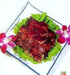 用 料:羊肉1000克,南姜50克,绍酒25克,红豉油20克,猪油1000克(耗150克)、上汤50克、五花肉250克,芒光丝(腌糖醋)100克,山楂糕丝100克。干面粉、酱油、川椒末、生蒜、芝麻油、精盐、淀粉、味精、二汤、生葱末适量。 制 法: 1、将羊肉洗净,红豉油、干淀粉拌匀涂在羊肉皮上,下油鼎炸至呈金黄色时捞起。 2、将炸好羊肉放入锅内(用竹蔑垫底),加入二汤、绍酒、南姜、生蒜、精盐、红豉油、五花肉(先切块炒香),放置炉上用旺火煮沸后,用文火炖至羊肉软烂,取出,捡去五花肉,羊肉拆去骨切件长5厘米,宽1.5厘米,摆落盘。用1小碗,放入酱油、味精、芝麻油、上汤、淀粉水调成碗芡。3、将羊肉放入蒸笼炊2分钟,取出,撒上干淀粉。烧热炒鼎下猪油,把羊肉倒入略炸, 倒回笊篱。顺鼎把川椒末、葱末炒香,投入羊肉,烹入绍酒,加入碗芡拌匀起鼎装盘。芒光丝,山楂糕丝拼盘。酱碟:甜酱。 特 点:香醇嫩滑。