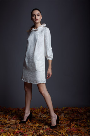 第四款:皱褶领口的丝绸裙 搭配要点: 1.这时一条属于时尚潮人的裙子,有趣的领口让它成为与众不同的潮流导向的裙装,整体轮廓很简洁,丝绸的质地赋予其精致感。 2.中长的收口袖是本季袖子的流行款。 3.为了突出裙子的特别,搭配一双简单的黑色高跟鞋。