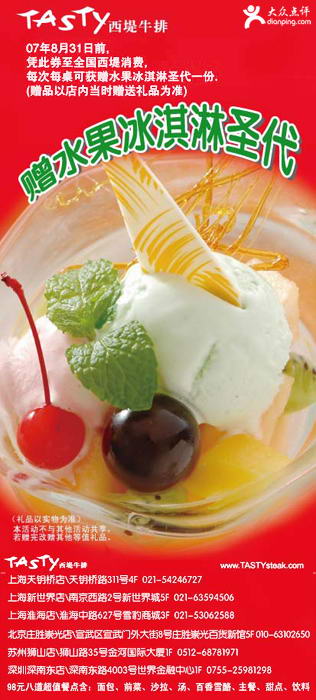 1.请将此优惠券打印或下载到手机上使用; 2.除特殊注明外,本优惠不能与其他优惠同时享受; 3.本优惠最终解释权归商家所有,如有疑问请与商家联系; 4.如需要更多的优惠信息,敬请登录大众点评网www.dianping.com。 西堤牛排: 宣武门外大街8号庄胜崇光百货南区新馆5楼(63102650) |