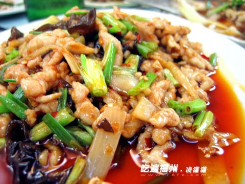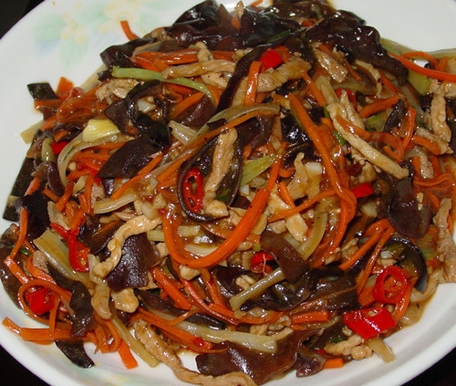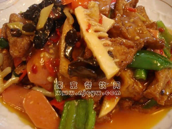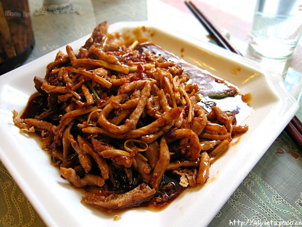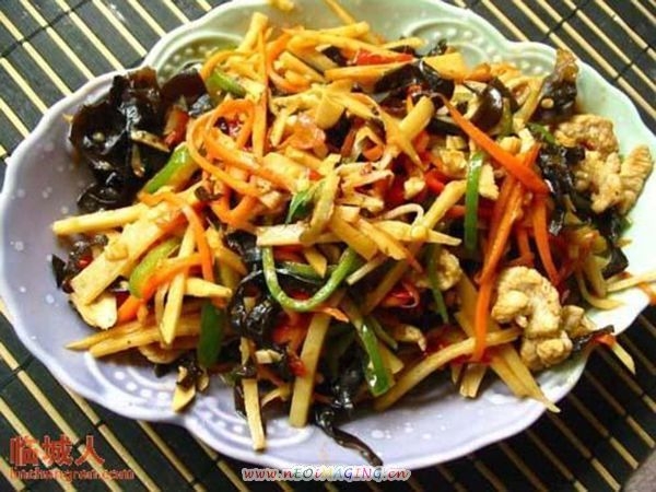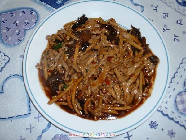 【特点】味甜微酸并咸辣,宜有作下酒饭。 【原料】瘦猪肉200克,水木耳30克,青菜30克,植物油75克,酱油20克,醋、葱、姜、蒜各10克,白糖、料酒、泡辣椒各13克,盐3克,湿淀粉15克,味精2克,汤适量。 【鱼香肉丝制作过程】 (1) 肉切丝,用少许酱油、盐、料酒拌匀,用湿淀粉浆好,拌些油。青菜、木耳水发透洗净均切丝,泡辣椒剁碎。葱、姜切末。 (2) 用糖、醋、酱油、葱、姜、蒜、料酒、味精、淀粉、汤对成汁。 (3) 炒勺烧热注油、油热后下肉丝用手勺推动散开,再加入泡辣椒炒出味后,即下发好的木耳和青菜,随着翻炒,倒入对好的汁,汁开时再翻炒几下即成。 |