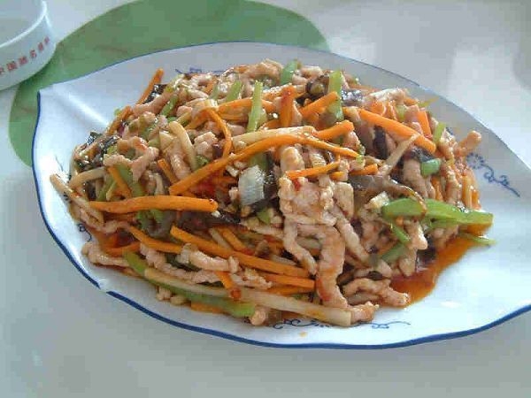 特点:以细猪肉为主料,配以冬菇、木耳,以四川特有鱼香调料软炒烹制而成。此菜色泽深红,咸甜酸辣兼备,鱼香鲜味浓郁,口味十分别致,深受食客称赞,享誉全国。 原料:瘦猪肉200克,水发木耳、水发玉兰片各25克,泡辣椒40克,酱油、白糖、蒜末各10克,葱花、料酒各15克,醋8克,精盐3克,味精1克,淀粉50克,油125克,清汤50克。 鱼香肉丝制法: 1.将泡辣椒切成碎末待用; 2.小碗内加入姜末、葱末、蒜末、精盐、白糖、醋、酱油、湿淀粉,调和均匀待用; 3.花生油烧至六成热,煸炒泡辣椒待出红油后,撒入辣椒粉,放入肉丝煸炒,菜肴将熟时,把小碗内兑好的汁倒入锅内翻拌均匀,淋入香油即. 鱼香肉丝的做法二