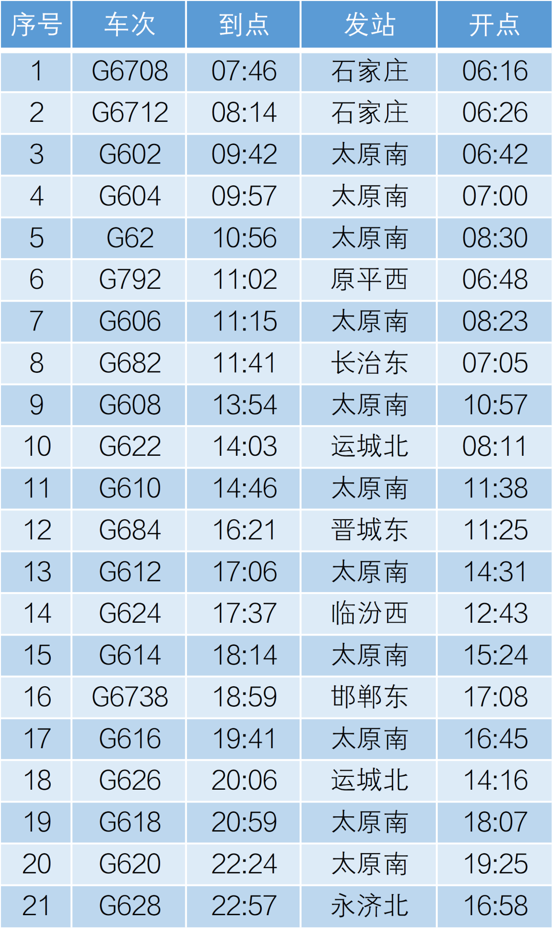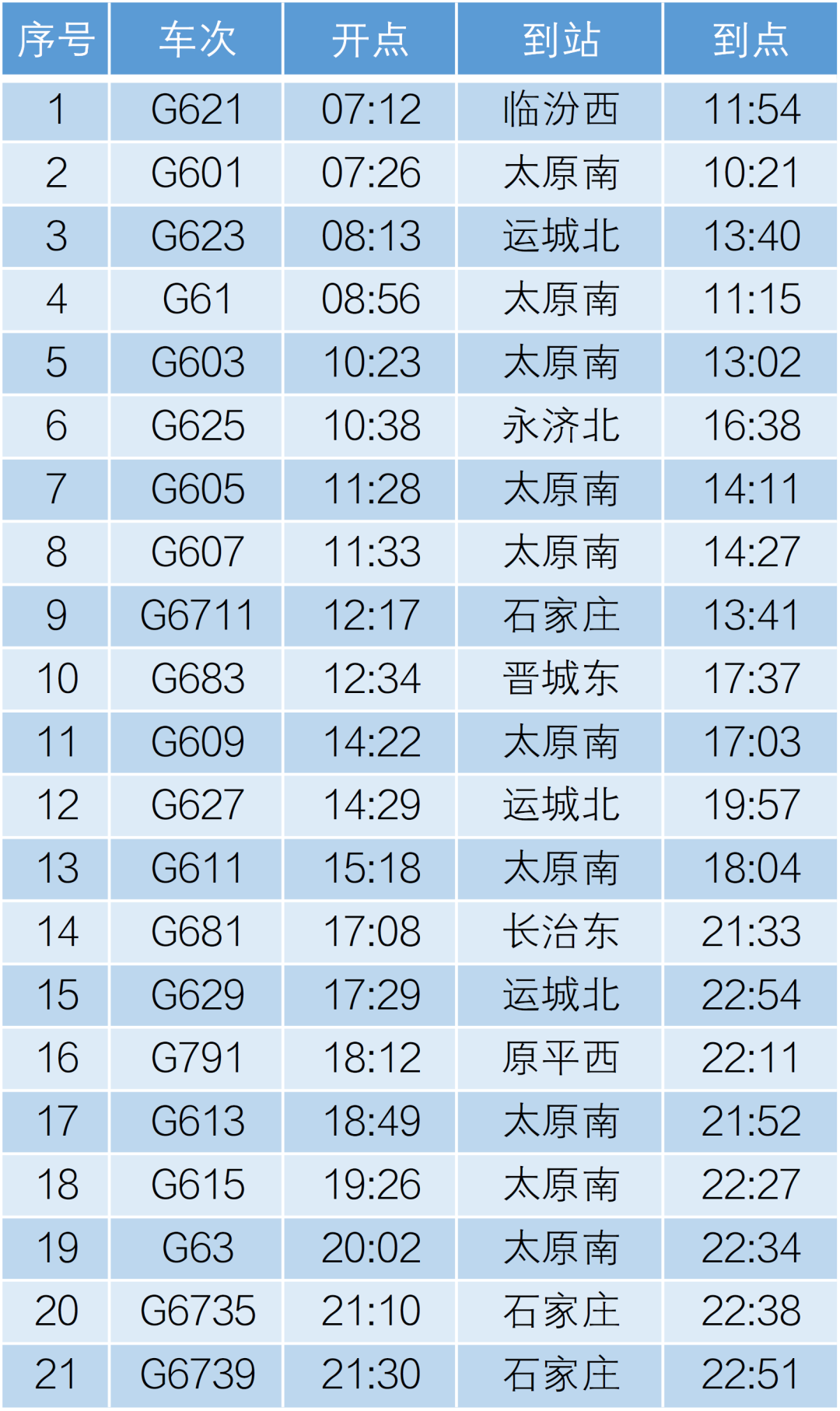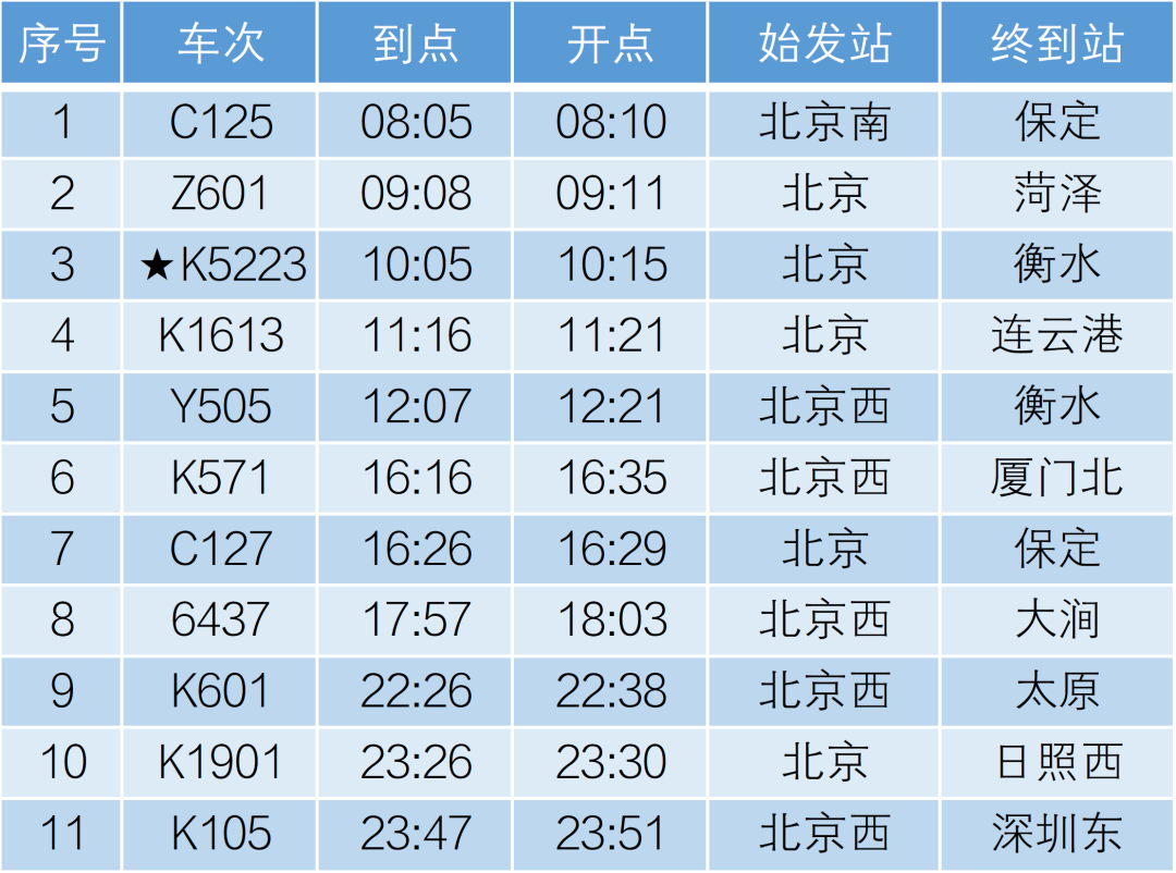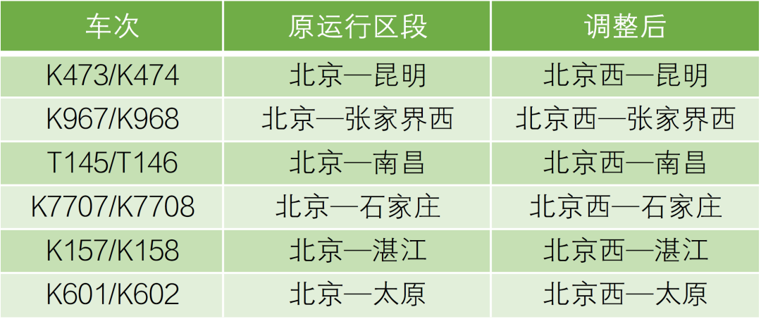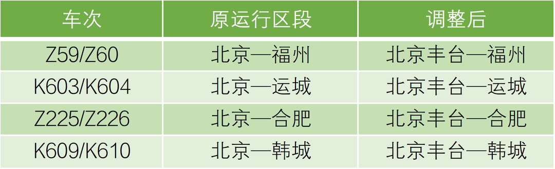说明: 1、带★车次为周末线(3对)。 (1)2604/1始发站逢周五、周六、周日及高峰期开行;2602/3始发站逢周六、周日、周一及高峰期起日次日至止日次日开行。 (2)1303/4次逢周五、周六、周日及高峰期开行。 (3)K5223/4次逢周五、周六、周日、周一及高峰期开行。 2、经停列车时刻为北京丰台站到发时刻。 特别提醒: 北京丰台站开通运营后,部分北京站、北京西站始发列车调整了始发车站,具体车次如下: 北京西站10对列车,调整至北京丰台站始发