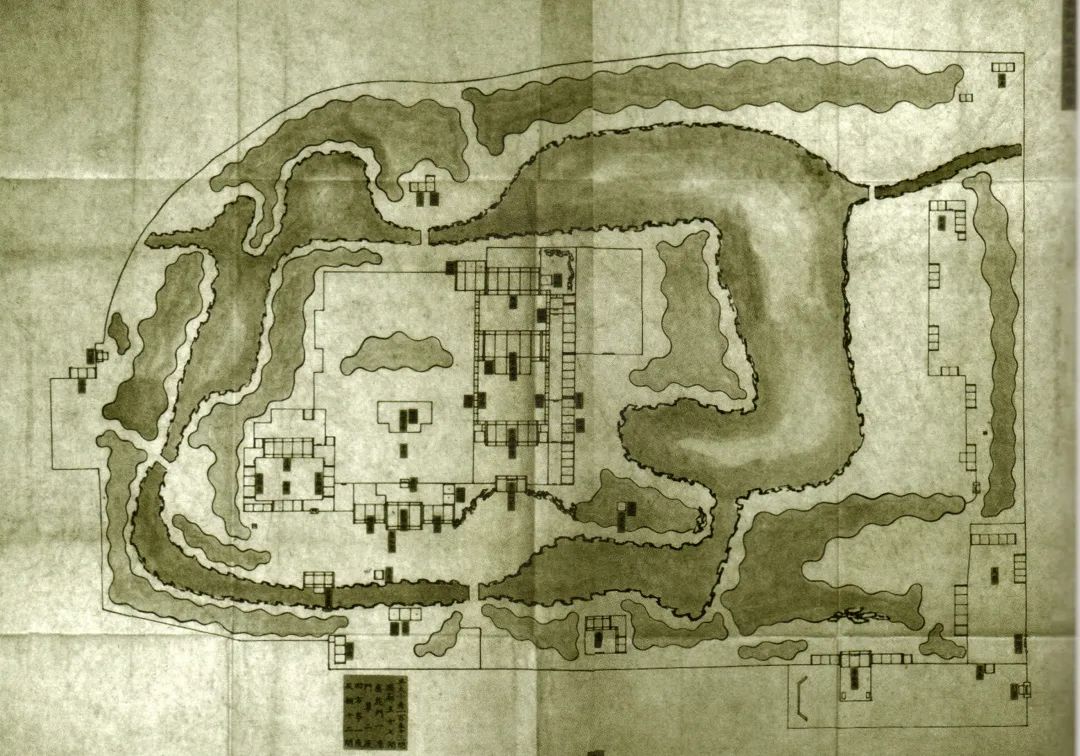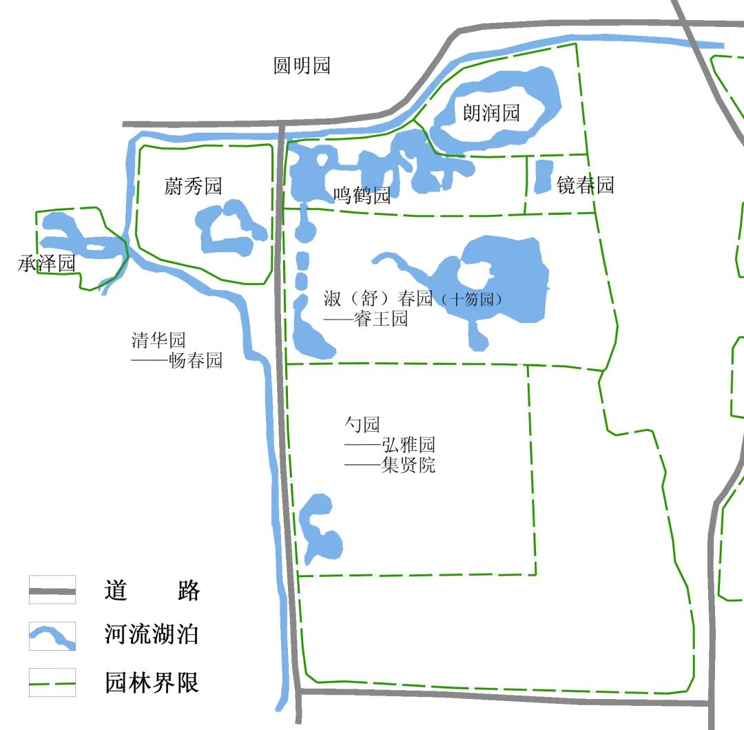 图 11 春和园地盘画样全图 (转引自贾珺,《北京私家园林志》,第356页) 民国初年,镜春园遭到军阀盗拆,有鉴于此,逊帝溥仪将朗润园改赐奕譞第七子载涛。载涛住在园中时,为近代的文物保护事业做出了巨大贡献。今日未名湖中的翻尾石鱼,办公楼前的石麒麟和丹陛石,圆明园西洋楼观水法御座后的石屏风等,都是载涛从圆明园运至朗润园保护起来,才避免了被倒卖的命运。 燕大建校后不久,载涛将朗润园租给学校作为教师住宅。1952年北大买下该园,在园内东、北岸建了教职工住宅和招待所,后来岛上的建筑也得到全面的修缮和扩建。季羡林先生曾居住在此,湖面上有季先生亲手植下的亭亭玉立的“季荷”。在中部岛上东南角的土山上有一块石碑,上有季先生亲题的“朗润园”三字。