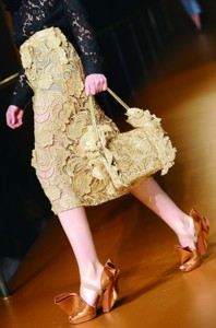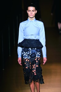 蕾丝也能塑造廓型 本季风尚的关键词之一即是廓型,只是不要想当然地认为只有呢子质地才能产生建筑般的轮廓,蕾丝同样可以。黑色的蕾丝与薄纱层层叠叠,制 成造型夸张的蓬蓬裙摆,再配上神秘诡异的烟熏妆容,就是从古堡里走出的精灵女子,比起那些萦绕着粉色蕾丝的甜美系公主显然更具诱惑。另外不得不提的仍是 PRADA,用层叠蕾丝营造出本季相当流行的腰间短裙效果,优雅而又干练