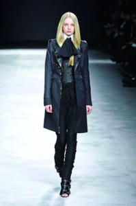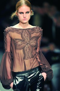 当蕾丝遭遇中性风 时尚似乎就是由矛盾碰撞而成的,本季设计师们喜欢用柔美的蕾丝搭配各种线条硬朗的中性单品,时刻提醒那些职场女强人们不要忘记自己的女 人本色。比如GIVENCHY用一件棕色蕾丝上衣搭配黑色紧身皮裤,上身飘逸潇洒,下身则充满坚毅色彩,用对比营造强烈的视觉冲击。风风火火的上班族则不 妨选择略带透视效果的蕾丝衬衫搭配一条曳地长裤,既洒脱又不失柔美风致。