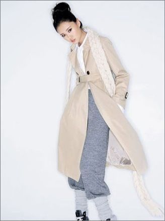硬挺的风衣面料与裤装柔软的针织面料搭配形成反差。 |