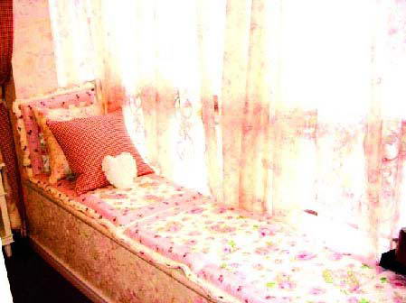飘窗不能移动,可家具却可以随意摆放。把床紧挨着飘窗而放,飘窗就变成了实用的床头柜,真是合理利用了空间!放上几本自己喜爱的书,摆上一盏别 致的台灯,有小女人情结的你不妨把自己漂亮的首饰挂在展板上,再放上一面小镜子,一杯清水,原来生活也可以很简单的!当清晨的阳光透过窗帘的缝隙轻轻唤醒 你时,睁开的第一眼,便仿佛看见了美丽心情。 |