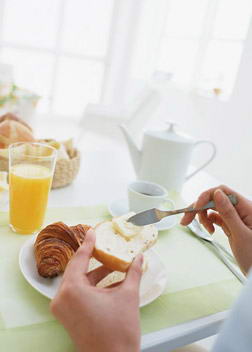 面包牛奶 营养师建议: 这类早餐蔬菜量少,所以要在中、晚餐多补充。咖啡一天控制在两杯以内。不过,茶和咖啡最好在餐前或餐后两小时才喝,因为会影响人体吸收铁质,所以尽可能不要在进餐时喝。这类早餐容易吃进过多油脂,一星期不宜超过3次。 建议不要点套餐,例如吃汉堡就不要再吃薯条。饮料选择小杯橙汁或牛奶,而不要喝糖分多的可乐。另外,当天的午餐、晚餐不要再吃炸、煎食物,尽量选择煮或蒸的烹调方式。