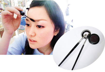 画眉毛最好用眉粉,比较之眉笔,眉粉更易着色,颜色最好不超过头发的颜色,所以棕黑色的效果最适宜。眉刷主要刷均匀眉粉,另外,眉毛比较硬质的美眉可选用眉扫。 Tips:眉粉尽量选用质地上乘的品牌,否则很容易短时间脱落;刷眉毛时顺时针方向,眉尾处逆时针打个小转,固定眉形。