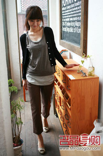 层层上衣的叠穿 条文圆摆的上衣,加上半透明直摆的上衣,外罩一件针织衫,上身很分明的层次加上一条简单的九分裤,美丽不言而喻啊!