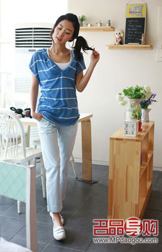 条纹帽衫+九分裤 九分裤加上条纹帽衫很活泼呢,蓝色的海边风情、白色的纯净清新,你会发现只用两个颜色就能拼出一个过目难忘的出游装。