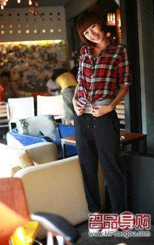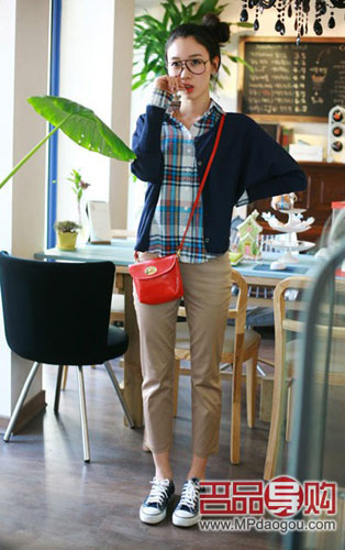 格子纹衬衫+九分裤好扮嫩 蓝配蓝、红配红,格子纹衬衫搭配针织最简单就醉熏这个原则,相当的嫩啊,很有春天的感觉哦,白色的九分裤刚刚好。