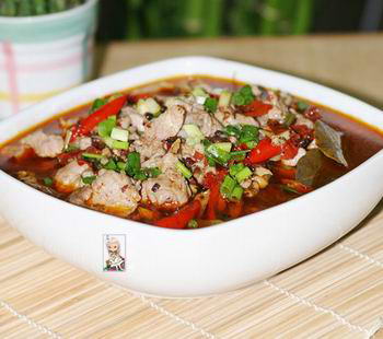 做法: 1.洗净所有配菜; 2.腌肉片--瘦肉切片用少量生粉、盐、料酒、姜片; 3.蒜苗切段、萝卜切丝、辣椒切圈、姜切片、香葱切花; 4.烧热食油,炸干辣椒和花椒,炸至棕色捞起,剁碎备用; 5.用锅里的油爆香姜片,放蒜苗萝卜炒熟,盛之盘中; 6.锅里烧热少许油炒豆瓣酱加适量水烧开,下肉片,放香叶、生抽、盐、糖、鸡精调味,肉熟关火,将汤及肉倒入盘中(倒在炒熟的青菜上); 7.把剁碎的辣椒、花椒粉撒在菜上,烧热少许油泼到菜上,再撒上葱花即可。 |