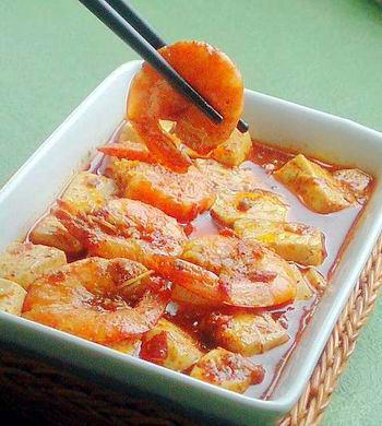做法: 1、豆腐切小方块,虾去头剪掉虾足,豆瓣切碎,把收拾好的虾放入碗中加盐淀粉拌匀; 2、豆腐放入加少许盐的开水中浸泡10分钟,炒锅放少许油烧9成热,放入虾煎熟后捞出控油; 3、留少许底油烧4成热,加豆瓣炒香,加辣椒粉煸炒; 4、加豆腐,虾段,料酒,生抽和适量的高汤中火烧2分钟,起锅时加鸡精撒上花椒粉。 |