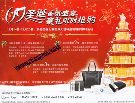 西单大悦城2009圣诞“香氛盛宴 豪礼限时抢购”,活动现场特别策划精彩演出,购买CK、Davidoff、MARC JOCBS、VERA WANG等品牌香水还有CK时尚拎包、Davidoff对笔套装等你拿,大量圣诞限量礼盒精彩奉献!