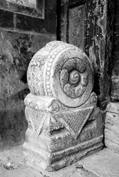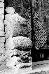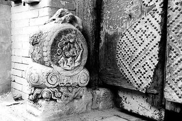 在其基础之上,稍微讲究一点的大门,将门纂下面的石头向外、向后加长。从形状上看,有做成长方形的如睡觉用的枕头,人们称这种门墩叫门枕。因这些构件面积较大,适合雕刻一些纹饰装点,故北京人喜欢在上面雕刻,以“卍”字图案为多,也有别的寓意深刻的吉祥图案。在门枕上多雕刻石狮一对,以镇宅保平安,同时也显赫家族地位。门枕和门墩的纹饰与影壁、门洞、垂花门、月亮门、门簪有机地结合在一起,才能显示出建筑与主人地位的融合。想必俗语“门如其人”就是此意吧。