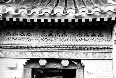 门,当然有门槛和门楣。一个在下,一个在上。门槛,象征着主人的地位高低,也起到“挡财气”,即把家里的财气挡住不外流的作用。在其上正对的就是“门楣”,就是门框上的横木。在其内和槛上有“门簪”,门簪是出入门上的一种饰物。安装门簪主要是为大门起着装饰作用。门簪外部做成圆柱形或六方、六角圆柱形。小户人家的门簪多为两枚,而大宅门的门簪多为四枚。门簪上面雕刻有吉词颂语。除此以外,还有门联、门拔、门钉、护门板,构成了“芥子纳须弥”的境界,将门文化和艺术表现得淋漓尽致。