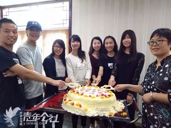 返程前,北京市台联悄悄准备了惊喜,给9月份过生日的7名学生1名老师准备了超大的生日蛋糕,在大家齐声的生日祝福中,他们一起吹熄蜡烛许下心愿。清华大学台生赖品竹称真的感到很惊喜和意外,没想到会和这么多人一起庆生,还有这么大的蛋糕。