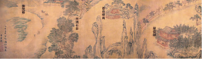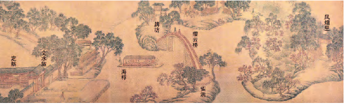 万历四十三年,吴彬为勺园绘制《勺园修禊图》,两年后米万钟也绘制了同名仿作。1998年,正值北京大学一百周年校庆,侯仁之院士提议,将精心复制的米万钟《勺园修禊图》制成了珍贵的校礼,赠送给最尊贵的客人。这是一幅高30厘米,长近3米的手卷长轴,欣赏时从右往左,随着手卷的展开,风烟里、缨云桥、文水陂、勺海堂、翠葆楼……昔日勺园的盛景一一呈现,观者仿佛又被带回到晚明名园的烟水迷离之中。