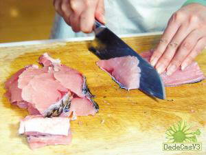 鲩鱼肉剔去鱼骨,斜切成薄片放进大碗里;葱切成葱花;姜剁成蓉。