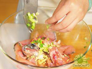 往碗里添入1/2汤匙盐、1汤匙酱油、1汤匙生粉、1/2汤匙料酒、1/8汤匙胡椒粉和3汤匙清水,洒入葱花和姜蓉搅拌均匀,腌制15分钟入味。