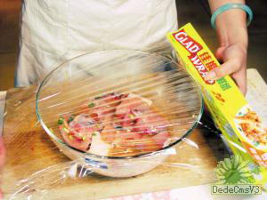 碗口用保鲜膜封好,放进微波炉高火加热4分钟取出,撕去保鲜膜。