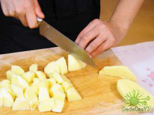 土豆去皮洗净,切成滚刀块,浸泡在清水中待用;姜切成片;葱切成段。