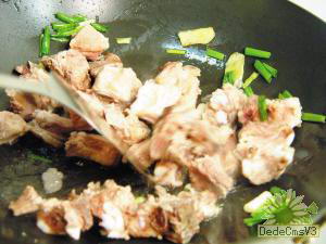 烧热锅内3汤匙油,爆香姜片和葱段,倒入6粒冰糖和排骨大火爆炒5分钟,直至排骨呈焦黄色。