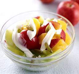1.将菠萝、苹果、猕猴桃、香蕉切成方糖大小的丁,小西红柿1分为4。