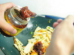 加入2汤匙辣豆瓣酱、1/3汤匙白糖、1/2汤匙鸡粉和1/3汤匙料酒,与胡萝卜、春笋一起拌炒均匀。