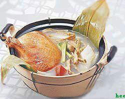 制作:先将蚬鸭剖杀,去除毛及内脏,洗净血污,砍成粗件备用。北沙参与玉竹分洗净,然后将上述汤料同放进汤煲内,先用中火,后用文火焖煮一个半小时,加味料。