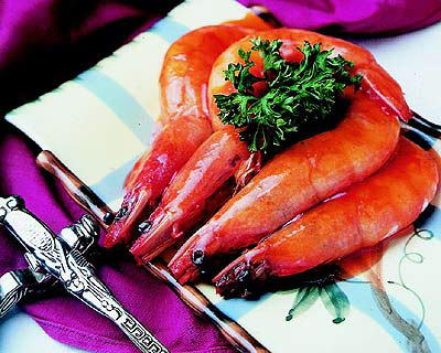 2.对虾体长而侧扁,长约18厘米左右,肉极鲜美。主要产于渤海湾,是我国特产之一。目前市场上一等品每斤约4~5头、烹制对虾的方法很多,油焖做法是北京传统风味,与罗汉大虾、琵琶大虾合称“京味三大虾”。这种做法既简便易行,又使虾肉人味。成菜红艳、油亮,滋味鲜、香、甜、咸。