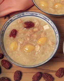 (11)红枣糯米粥:山药、苡仁、荸荠、大枣、糯米同煮,放入适量白糖,有健脾胃、益气血、利湿止泻、生津止渴之功效,适用于病后体弱及贫血、营养不良、食欲不振、慢性肠炎等患者食用。