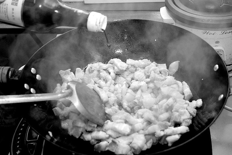 2、将五花肉炒成七分熟,加少许酱油调成浅红色,然后捞出;