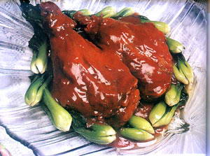 制法:将羊肉用开水焯熟捞起冼净,放入炖盅,加入红豉油、绍酒、南姜、生蒜、酱油、南乳汁和二汤,放进蒸笼炊约3小时取出,捡去姜、蒜,拆去羊骨,羊肉切件装入碗中,加入原汁,放进蒸笼蒸热,取出翻置装盘,原汁滗出下鼎,加入味精、芝麻油、胡椒粉,用淀粉水勾薄湖,淋在着肉上即成。酱碟:香醋。