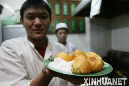 北京九门小吃奶酪魏的厨师在展示奶油炸糕(11月3日摄)。