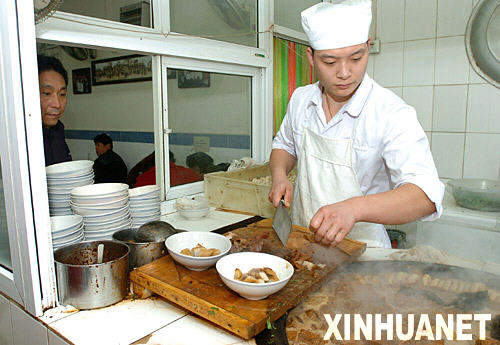 北京前门小肠陈的厨师在制作卤煮火烧(10月24日摄)。新华社记者季春鹏摄