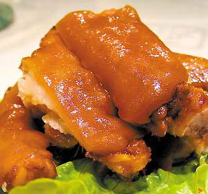 6)猪手炖八成软后,加入冰糖及适量的盐调味,并大火收下汁。